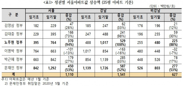 경실련 "집값 상승률 1위 노무현 정부, 상승액 1위 문재인 정부"