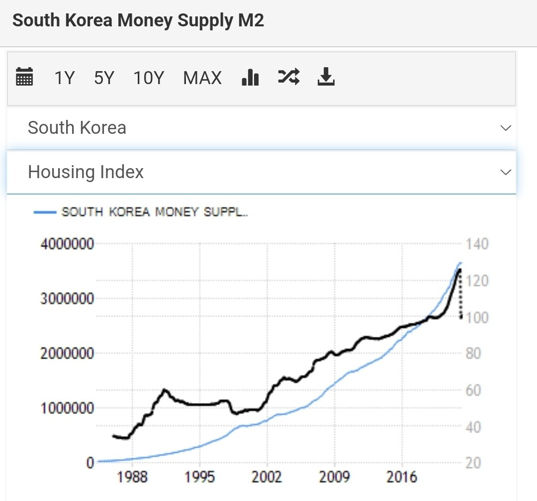 - Housing Index와 M2, Stock Market과 M2는 거의 유사한 방향으로 움직임